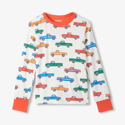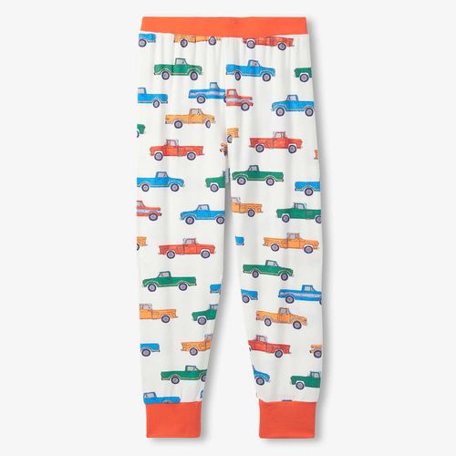 Little truck drivers will love drifting off to sleep in these bamboo pajamas featuring bold vehicle designs. Crafted from silky bamboo viscose, the fabric naturally wicks moisture and adapts to your child's body temperature for restful nights. The snug, safety-approved fit keeps up with active sleepers, while the elastic waistband provides all-night comfort without restriction. Colorful trim details bring extra personality to bedtime. Ideal for boys who dream in diesel and adventure.