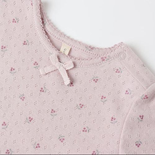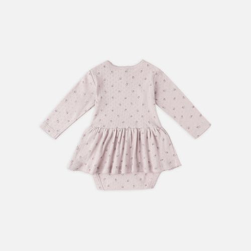 Meet the ultimate playdate essential—our Pointelle Skirted Bodysuit in lilac ditsy! This charming one-piece combines a twirly peplum skirt with cozy long sleeves and an adorable bow detail at the neckline that'll have everyone saying "aww." The soft pointelle fabric feels gentle against delicate skin while adding lovely texture and breathability for all-day comfort. Dressed in a dreamy lilac hue with a sweet ditsy print, it's the kind of piece that makes getting dressed fun. Practical snap closures at the shoulders and bottom mean diaper changes happen in seconds—no wrestling required. Whether paired with tights for cooler days or worn solo when the weather warms up, this versatile bodysuit is ready for whatever adventures come next.