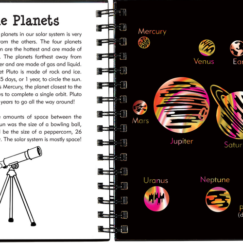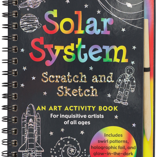 Unleash your creativity as you explore the solar system by scratching away white outlines and revealing sparkly foil, colorful swirls, and glow-in-the-dark planets, moons, comets, and more. Includes a trace-along scratch and sketch activity with wooden stylus, as well as extra pages for independent drawing. Suitable for ages 5 and up.