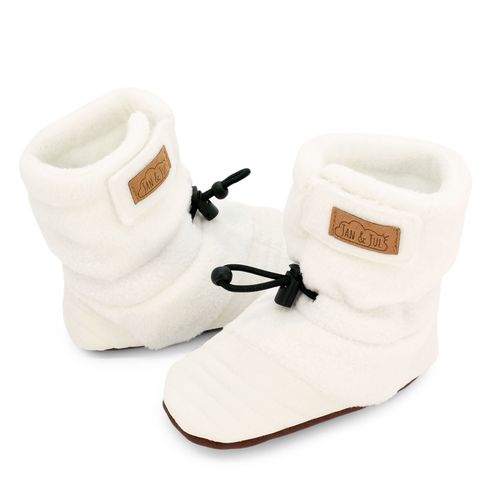 Keep your little one's feet snug and secure with our Stay-Put Cozy Booties in Cream! Designed for the most energetic explorers, these booties feature an adjustable elastic drawstring and an easy Velcro tab to ensure they never slip off during playtime. Crafted from soft, warm fleece, they offer cozy comfort that your baby will love. The flexible, durable PU soles are reinforced at the toe and heel, providing excellent protection while encouraging natural movement. Lightweight and breathable, these booties are perfect for babies and first-time walkers discovering the world. Plus, they’re a breeze to keep clean—just machine wash on a gentle cycle and air dry. With these booties, every step is comfy, safe, and ready for fun!
