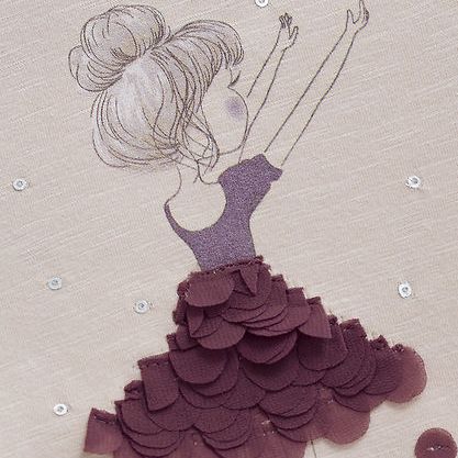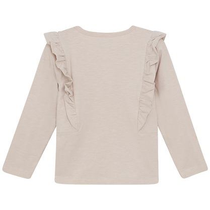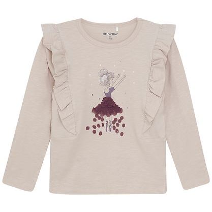 This charming Minymo blouse brings a touch of whimsy with its delightful ballerina print adorned with shimmering purple and silver sequin accents. Crafted in soft beige, it features convenient push-button closures at the shoulder, flowing long sleeves, and playful ruffle detailing that frames the neckline. Perfect for little dancers and dreamers who love a bit of sparkle!