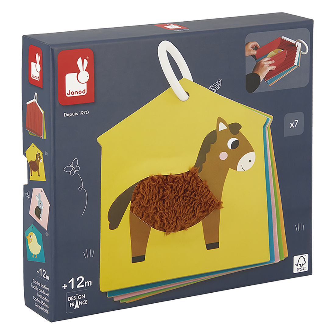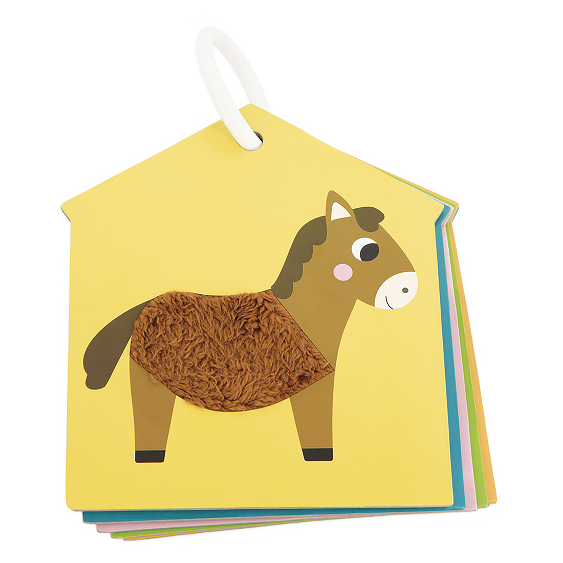 Discover the farm animals! When opening the farm gates, your child will discover one of 6 textured farm animal themed cards. Who is the sweetest? Is it the cow or the rabbit? This awakening toy is ideal for developing the sense of touch. It is also very practical to carry everywhere thanks to its plastic ring.