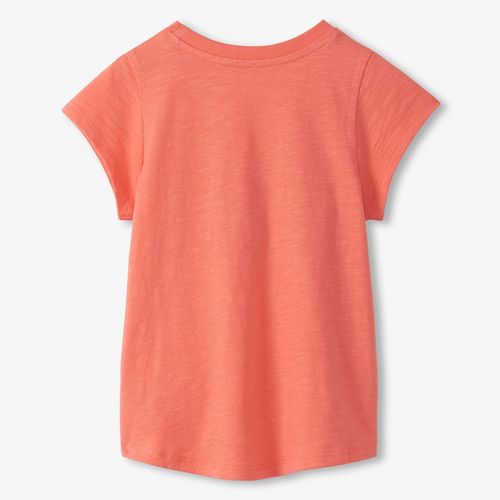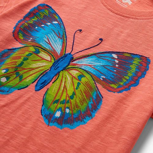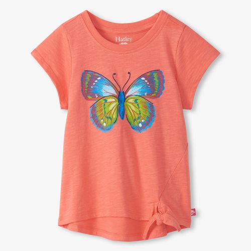 Watch her light up in this charming butterfly tee! Featuring a striking multi-coloured butterfly design in blues, reds, greens, and teals against a soothing coral heathered base, this shirt brings personality to playtime. The embroidered details add a touch of dimension, while the playful side-tie knot at the hem gives it that extra special flair. Made from soft, breathable cotton, it's the perfect pick for a girl who loves nature-inspired style with comfort she can wear all day long.