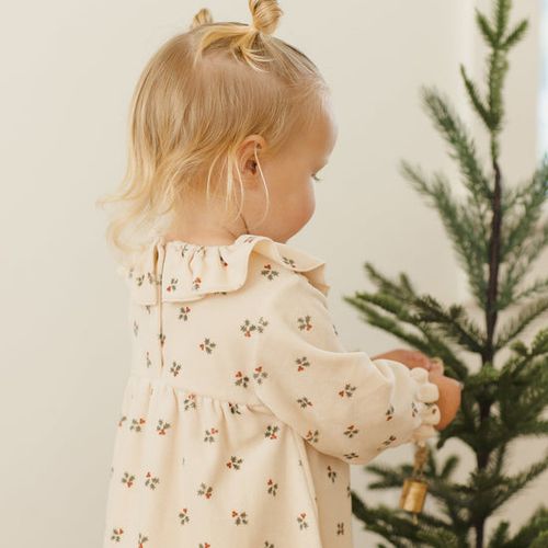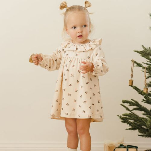 Introducing the Velour Baby Dress in Holly Berry – a delightfully cozy choice for your little one! This charming empire waist design features soft, touchable velour fabric that's gentle against delicate skin. Long sleeves provide extra warmth and coverage, while the adorable ruffled collar adds a playful finishing touch. The festive holly berry print pops beautifully against the natural background, making it perfect for holiday celebrations or everyday wear. Whether you're dressing up for a special occasion or keeping things casual, this dress combines comfort with undeniable cuteness. The relaxed fit allows plenty of room for movement and growth, making it a practical favorite that your baby will love wearing again and again.