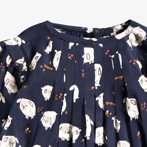 This navy blue dress is decorated with charming sheep prints. It has a round neckline and playful ruffles on the upper sleeves, adding a sweet touch. Elastic cuffs provide a comfy fit, while the flared skirt makes it perfect for twirling fun!