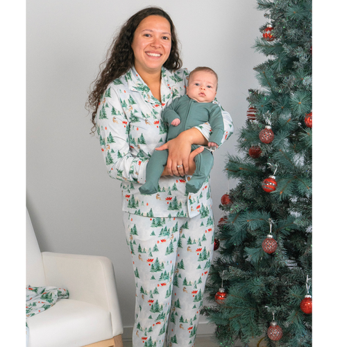 Slip into pure comfort with our Women's Classic PJ's in the whimsical Sleigh Ride print. Crafted from luxuriously soft bamboo rayon, these pajamas feel absolutely heavenly against your skin. The timeless button-front top pairs perfectly with relaxed straight-leg pants for effortless style. Featuring a charming digital print of a snowy forest sleigh adventure, these festive PJ's bring cozy holiday vibes to bedtime all season long.