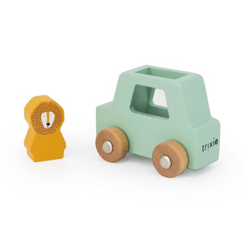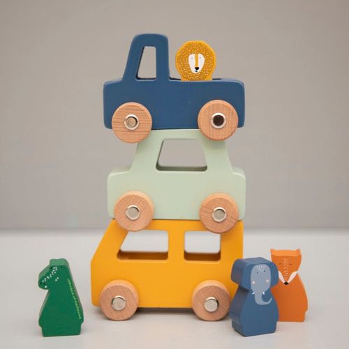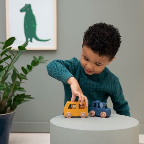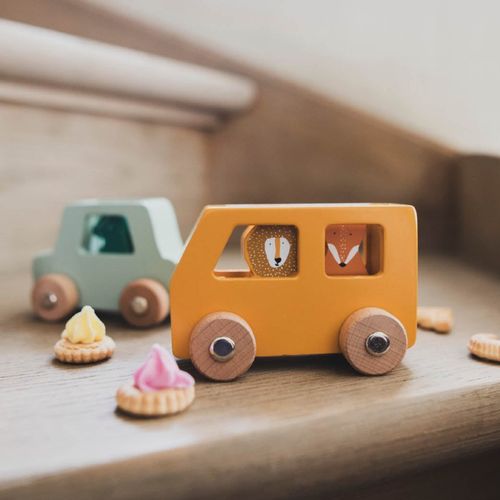 Toot, toot! Here come our animal friends in their cars. Mr. Crocodile has a cool truck to ride in. Mrs. Elephant and Mr. Fox share a ride in their big yellow bus. Mr. Lion has its own little car to drive around in. Each animal fits in each car, offering many fun ways to play with these 4 animals and 3 cars. The complete set is made of 100% FSC® certified wood. All paints on this product are water-based, safe for children and non-toxic.