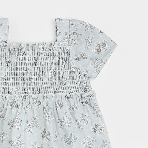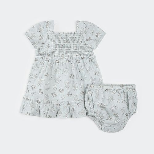 Let your little one spin and play in this charming blue floral dress set. The lightweight, breathable cotton cross-hatch fabric keeps her cool through warm weather adventures, while the smocked bodice and flowing tiered skirt create that twirl-worthy silhouette every toddler loves. Crafted from 100% organically grown cotton, it's gentle on delicate skin. The included diaper cover provides practical layering for worry-free playtime. Perfect for summer outings, family photos, or just dancing around the house. Available in sizes 3–24M.