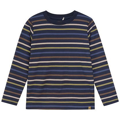 Introducing the Yarn-Dye T-Shirt in Parisian Night – a charming long sleeve essential that brings European-inspired style to your little one's wardrobe. Crafted by Smart Minymo, this thoughtfully designed tee features a rich dark blue base adorned with horizontal stripes in complementary shades of blue, brown, beige, and green. The classic round neckline is finished with soft ribbing for comfort and durability, while convenient push buttons at the left shoulder make dressing and undressing a breeze for busy parents and active kids. Perfect for layering through the seasons or wearing solo, this versatile striped shirt pairs effortlessly with jeans, shorts, or skirts for endless outfit combinations that feel both timeless and playfully put-together.