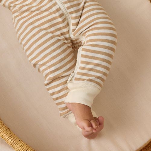 Zip Long Sleeve Sleeper made from our soft organic brushed fabric to keep your little one endlessly cozy through the night and all day adventures. Designed with double zippers for easy changes—no more wrestling with buttons or snaps during diaper duty! The cheerful gold stripe print adds a touch of sunshine to bedtime routines. Crafted from gentle, breathable organic materials, this sleeper keeps kids comfortable whether they're napping, playing, or snoozing. Perfect for little ones who love to move and groove, this sleeper grows with them through all their cozy moments.